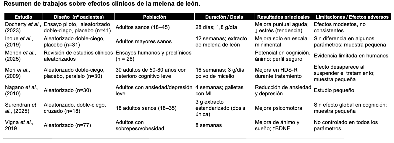 Una revisión sistemática publicada en abril de 2025 (Contato AG et al., 2025) muestra los posibles efectos beneficiosos de la melena de león, que incluyen: neuroprotección, mejora de funciones cognitivas, efectos antitumorales (inhibición de proliferación en células cancerÃgenas), beneficios sobre la salud digestiva (microbiota intestinal, inflamación), y efectos positivos sobre ánimo y trastornos del estado de ánimo (ansiedad, depresión). En cuanto a la seguridad, los efectos adversos documentados son generalmente leves y transitorios: molestias digestivas, reacciones alérgicas, cefaleas, etc.Â