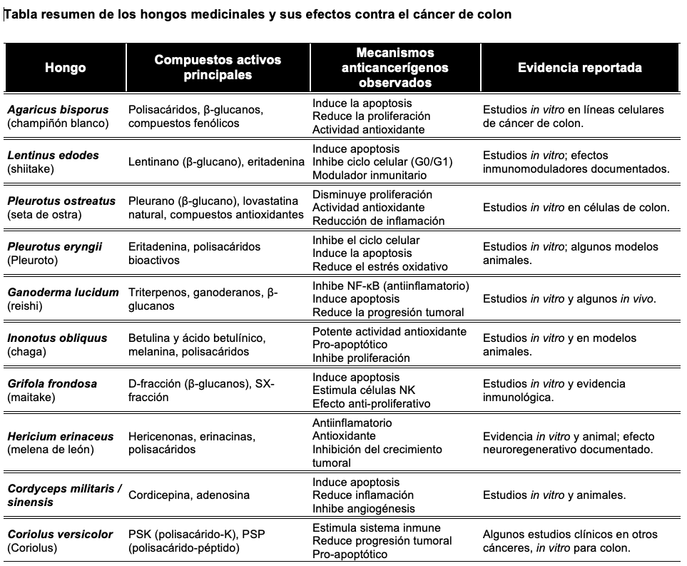 Los hongos medicinales han mostrado, in vitro e in vivo, interesantes efectos anticancerÃgenos contra el cáncer de colon mediante diferentes mecanismos, entre ellos:Â